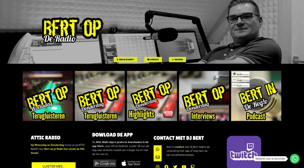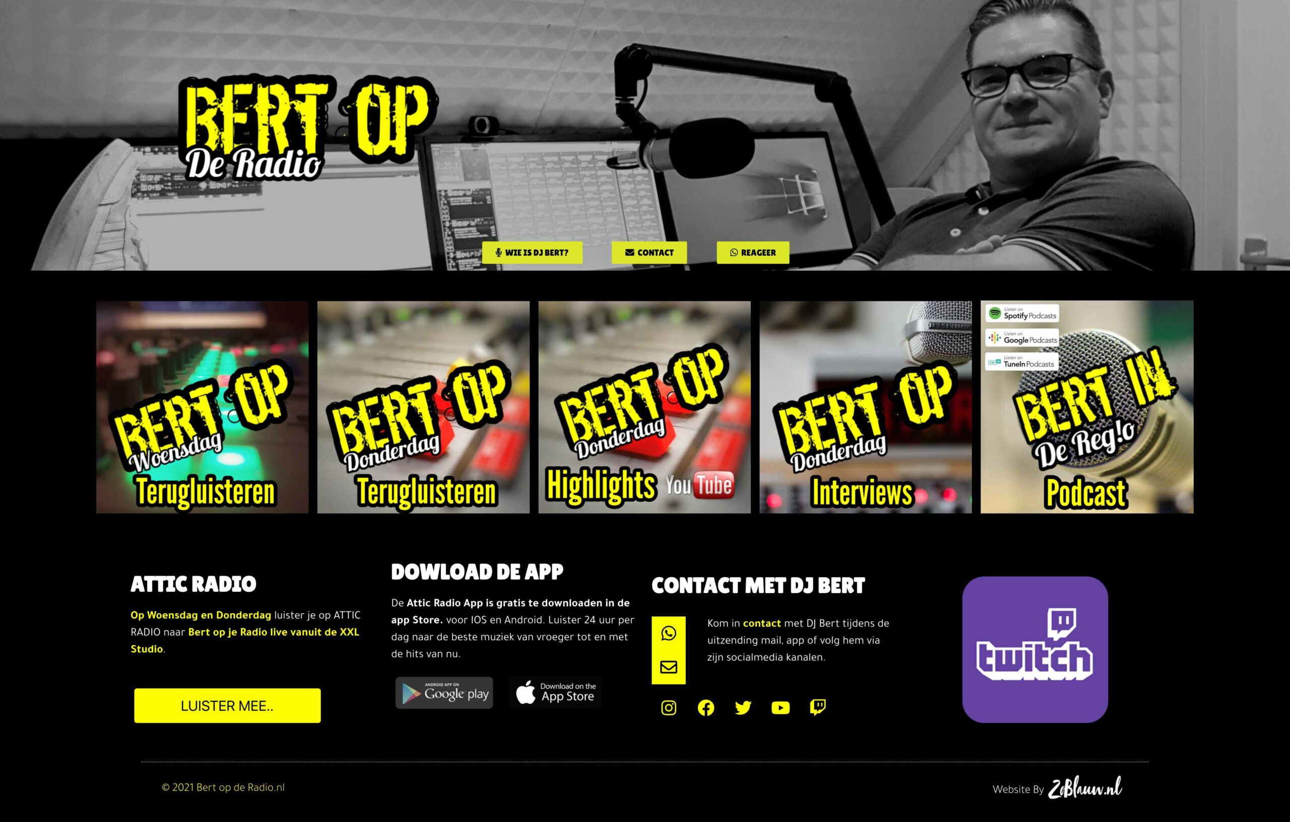 Een complete website update voor Bertopderadio.nl in een gezamenlijke huisstijl voor zowel AtticRadio.nl en de DJ Bert en ook voor Eric Verbruggen van Kick FM (deze volgt nog) is de website opgebouwd.