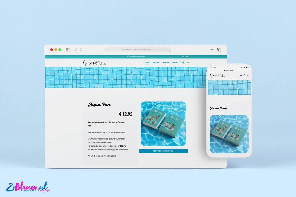 Aqua Fun een kaartspel voor in het water van ‘Games by Julia’. ZoBlauw heeft de webshop mogen maken voor dit leuke kaartspel dat je speelt in het zwembad of meeneemt naar de kust.